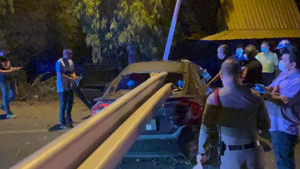 ที่เกิดเหตุพบรถเก๋งยี่ห้อ Honda Civic สีดำ ทะเบียนนนทบุรี 1 คัน สภาพพังยับเยิน พุ่งชนเสาไฟฟ้า จอดอยู่เลนซ้ายสุด บริเวณหน้ารถถูกการ์ดเรลยาวกว่า 10 เมตร พุ่งเสียบกระจกหน้าทะลุกระจกหลัง