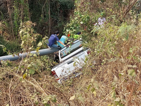 จึงประสานหน่วยกู้ภัยในพื้นที่หลายหน่วยรุดไปยังที่เกิดเหตุ พบรถยนต์ ยี่ห้อ Isuzu D-Max หมายเลข 8601 ตาก พบชาย 2 คนติดอยู่ในรถยนต์ อายุประมาณ 30 ปี ได้รับบาดเจ็บสาหัส จึงช่วยเหลือคนแรกเป็นผู้โดยสารออกมาจากก่อน และทำการปฐมพยาบาลเบื้องต้น ต่อมาได้ช่วยเหลืออีกคน โดยเจ้าหน้าที่ต้องใช้เครื่องตัดถ่างนำผู้ได้รับบาดเจ็บออกมาอย่างทุลักทุเล ใช้เวลาร่วม 1 ชั่วโมง