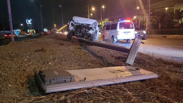 ที่เกิดเหตุบนเกาะกลางถนน พบรถยนต์กระบะ ยี่ห้อ Isuzu D-Max สีขาว ทะเบียน 2 ฒร 8313 กรุงเทพมหานคร ปีนอยู่บนเกาะกลาง สภาพหน้ารถพังยับ ที่พื้นถนนพบเศษกระจกแตกกระจายเกลื่อนถนน ที่บริเวณหน้ารถพบเสาไฟส่องสว่างหัก จำนวน 1 ต้น ห่างออกไปประมาณเกือบ 500 เมตร ที่เลนขวาพบรถตู้พยาบาลเทศบาลเมืองแพรกษาใหม่ จอดอยู่ สภาพท้ายยุบกระจกหลังแตก