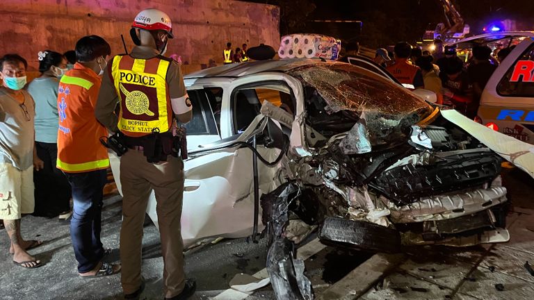 ที่เกิดเหตุพบรถเก๋ง ยี่ห้อ Mitsubishi Mirage สีขาว ทะเบียนชลบุรี พุ่งเกยฟุตบาท 1 คัน สภาพหน้ารถพังยับเยิน ภายในพบผู้เสียชีวิต 1 ราย ทราบชื่อคือ นายโรจนัสถ์ ริชาร์ด กรีช อายุ 26 ปี หนุ่มลูกครึ่ง ชาวจังหวัดชลบุรี นอนเสียชีวิตบริเวณเบาะคนขับ สภาพขาขวาหัก ตามร่างกายมีรอยฟกช้ำจากแรงกระแทกหลายจุด