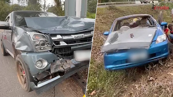 กระบะ Isuzu D-Max กลับจากงานเลี้ยง พุ่งชนเก๋ง Honda Civic ยับ สาวกระเด็นออกนอกรถ บาดเจ็บ 2 ราย