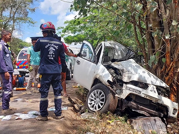 Mitsubishi Pajero เร่งแซง 10 ล้อ รถสะบัดเสียหลักพุ่งชนเสาไฟฟ้าขาด ซ้ำชนต้นไม้ริมทางดับ
