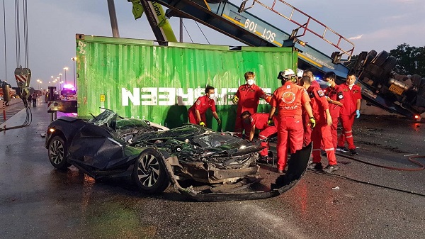 รถพ่วงบรรทุกตู้คอนเทนเนอร์พลิกคว่ำ ทับเก๋ง Honda Civic พยาบาลสาวดับคาที่