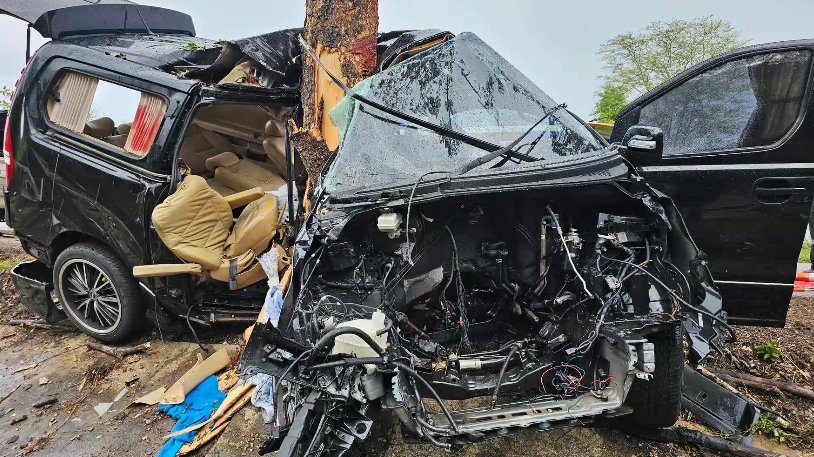 ที่เกิดเหตุพบ รถตู้ Hyundai H1 สีดำ หมายทะเบียน ฮษ 190 กรุงเทพมหานคร ชนกับต้นไม้ข้างทาง ขนาดกว่า 1 คนโอบ สภาพรถพังยับเกือบหักครึ่งท่อนจนเครื่องยนต์กระเด็นหลุดออกจากตัวรถ มีผู้ได้รับบาดเจ็บสาหัสติดอยู่ภายในรถ 2 ราย