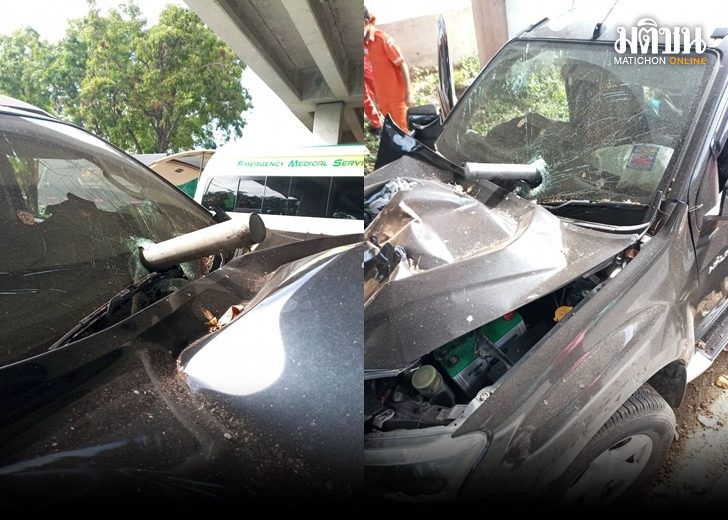 หนุ่มใหญ่ Isuzu D-Max ขับรถชนเหล็กทะลุกระจก บาดเจ็บเล็กน้อย