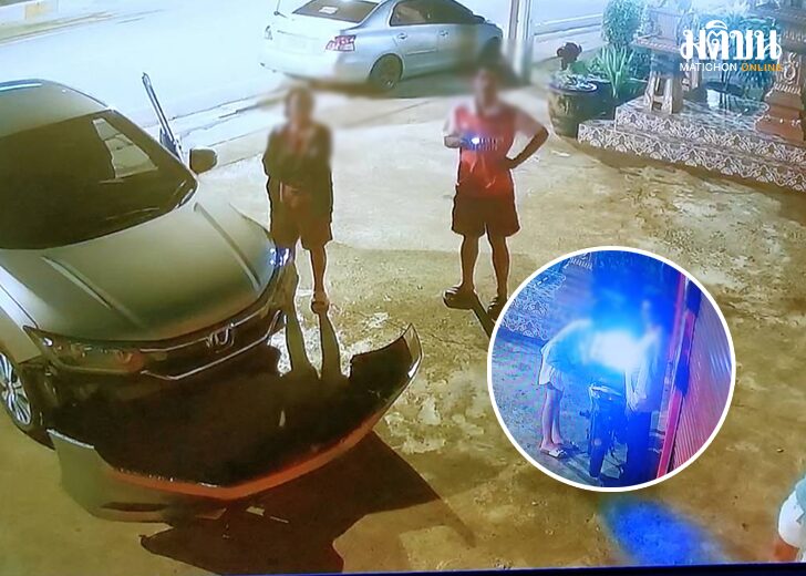 จึงไปเปิดกล้องวงจรปิดดูพบว่า มีรถเก๋งเข้ามาจอดและขับชนประตูร้านของตน แล้วขับออกไปสักพัก แล้วรถคันเดิมขับกลับมาจอดที่หน้าร้านโดยมีหญิง 2 คนลงมา อีกสักพักมีผู้ชายขับรถเก๋งตามมา คงจะไปตามญาติมา ต่อมามีเจ้าหน้าที่ประกันภัยมาดูที่เกิดเหตุ ถ่ายรูปเสร็จเขียนใบเคลมประกัน มาสอดไว้ใต้ประตูที่พื้นหน้าบ้านเข้ามาในร้าน แล้วทั้งหมดก็ออกจากหน้าร้านไป