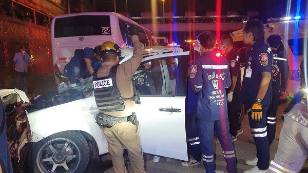 เมื่อเวลา 01.30 น. ร.ต.อ.อดิเทพ โพธิ์เจริญ รองสารวัตรสอบสวน สภ.เมืองสมุทรปราการ รับแจ้งมีอุบัติเหตุรถยนต์กระบะชน Isuzu D-Max ท้ายรถบัส มีผู้เสียชีวิต ติดอยู่ภายในรถ บริเวณหน้าวัดแพรกษา ตำบลแพรกษา อำเภอเมือง จังหวัดสมุทรปราการ